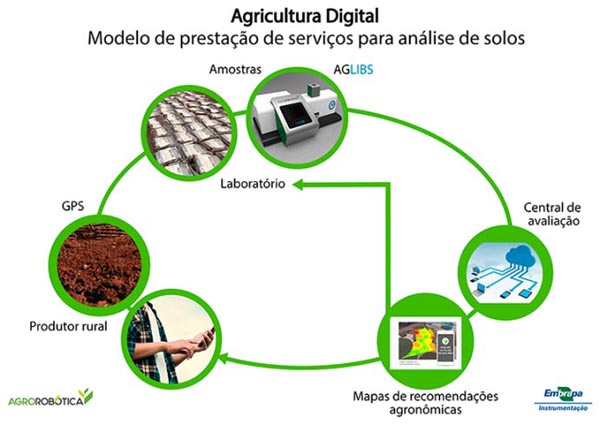 Em três anos de calibração, o AGLIBS já analisou mais de duas mil amostras de solos tropicais de várias regiões brasileiras. As amostras coletadas em campo com a ajuda de um aplicativo gratuito para registro e localização são recebidas pelas empresas franqueadas já identificadas com códigos de barras, contendo as informações do cliente e tipo de serviço a ser realizado. Depois, as amostras passam por processo de secagem e, em seguida, por moagem. O passo seguinte é transformar a amostra numa pastilha para ser analisada pelo AGLIBS em segundos.