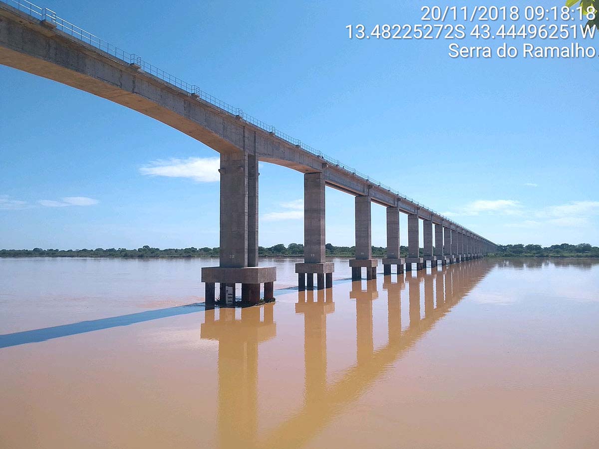 Cumprindo o traçado original de 1893, a Fiol atravessa o rio São Francisco, hoje território do município de Serra do Ramalho/BA.